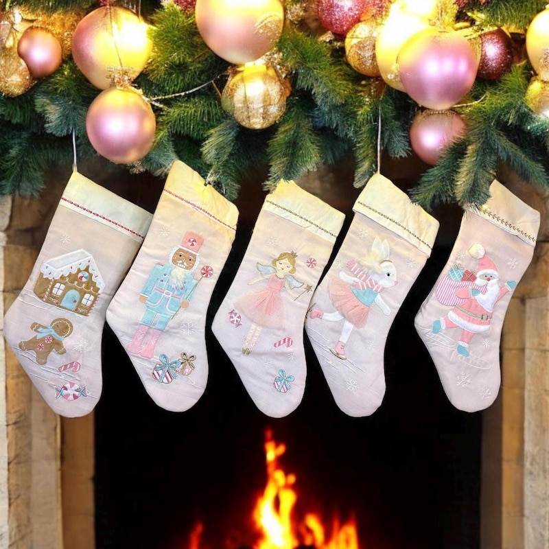 ~Stocking Base is polyester linen with 3D embellishments: Pink Tutu on Skating Bunny and Fairy, White Pom Ear Muff on Bunny, Beard on Nutcracker, Pom on Santa's Hat, Fur on Santa Coat