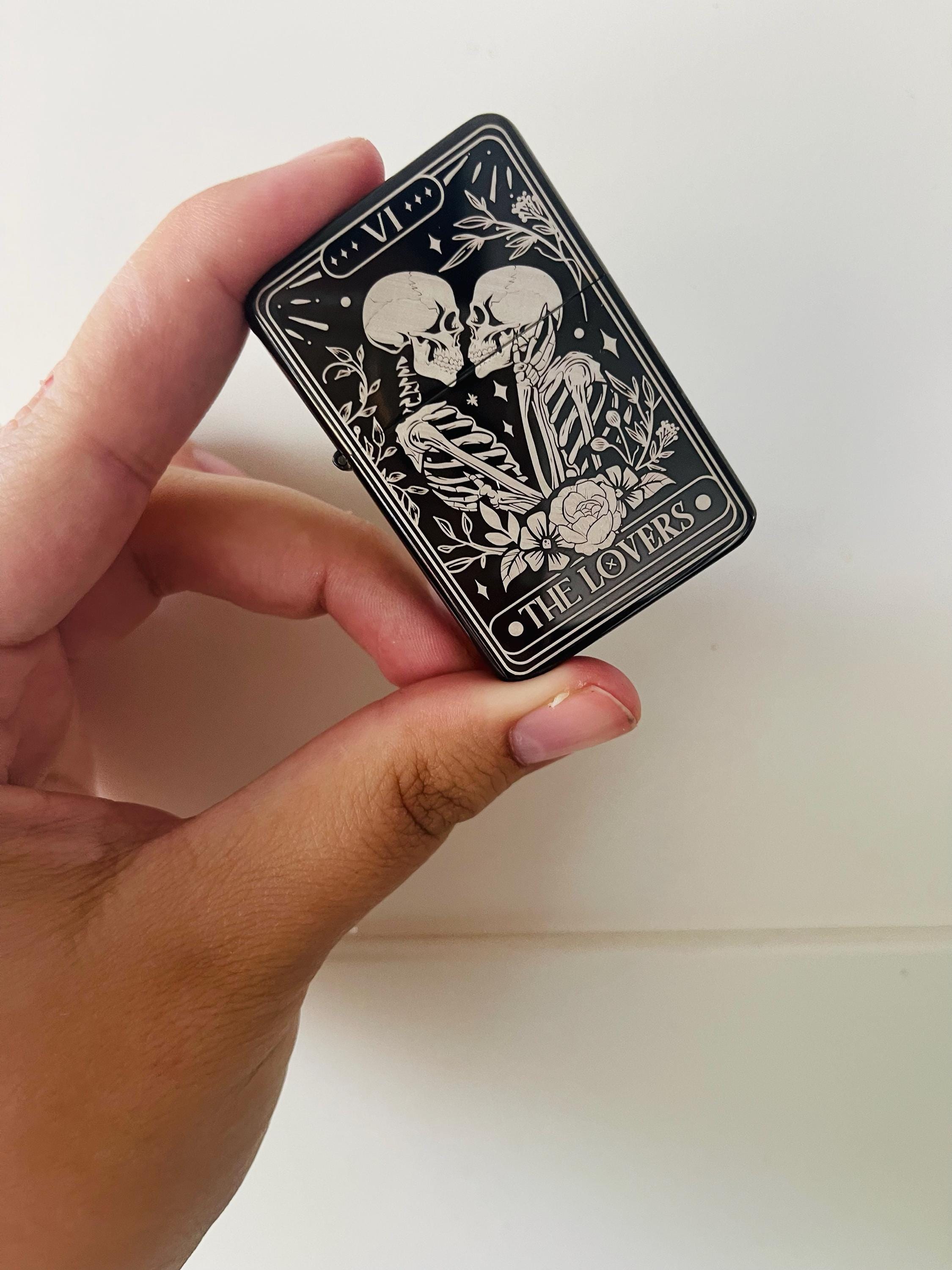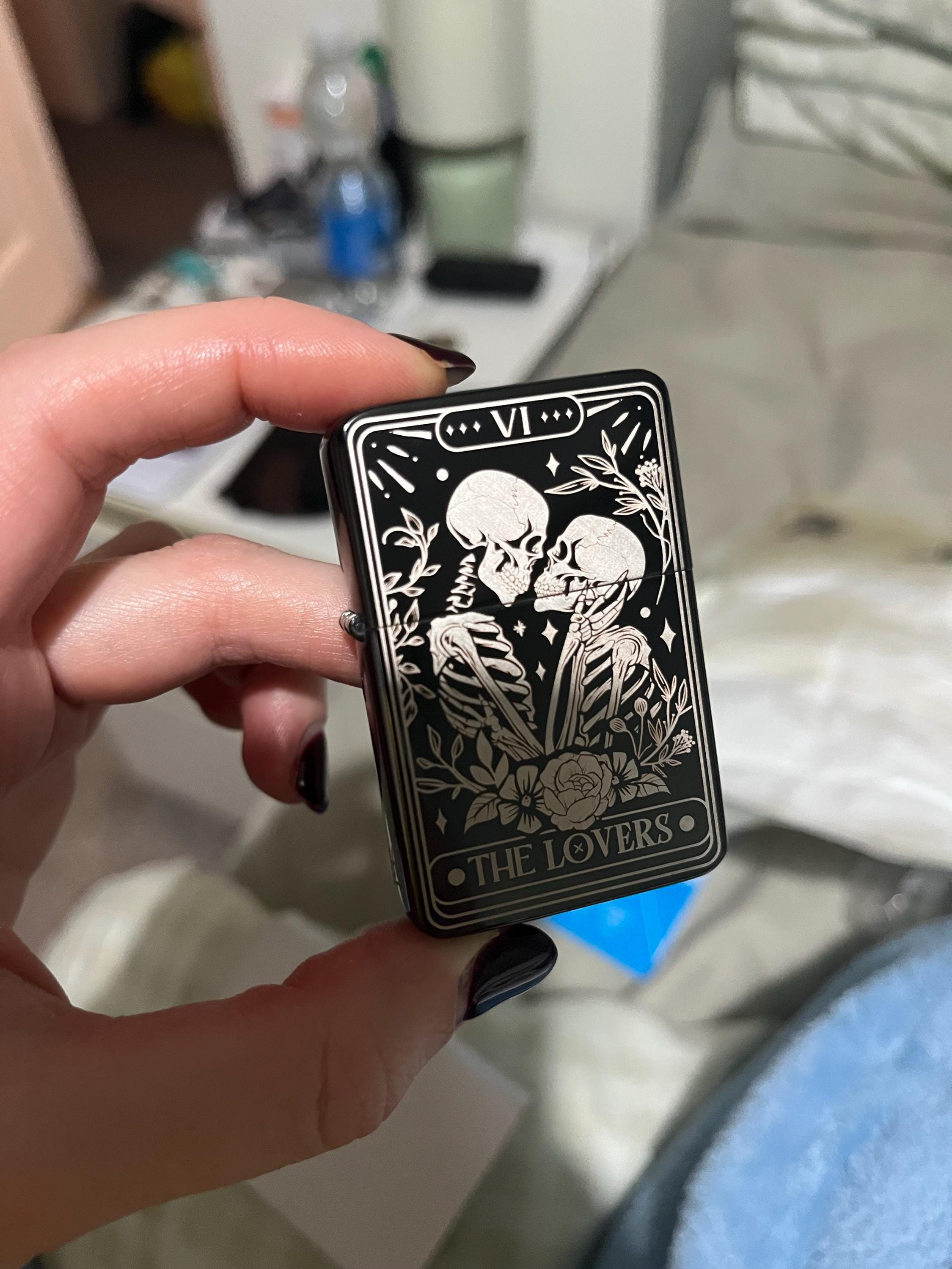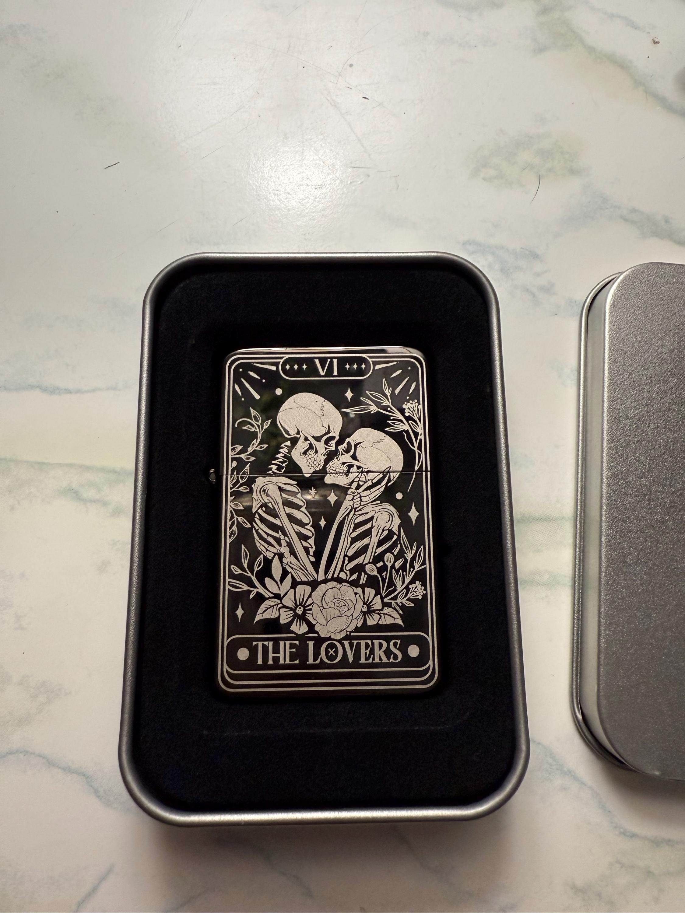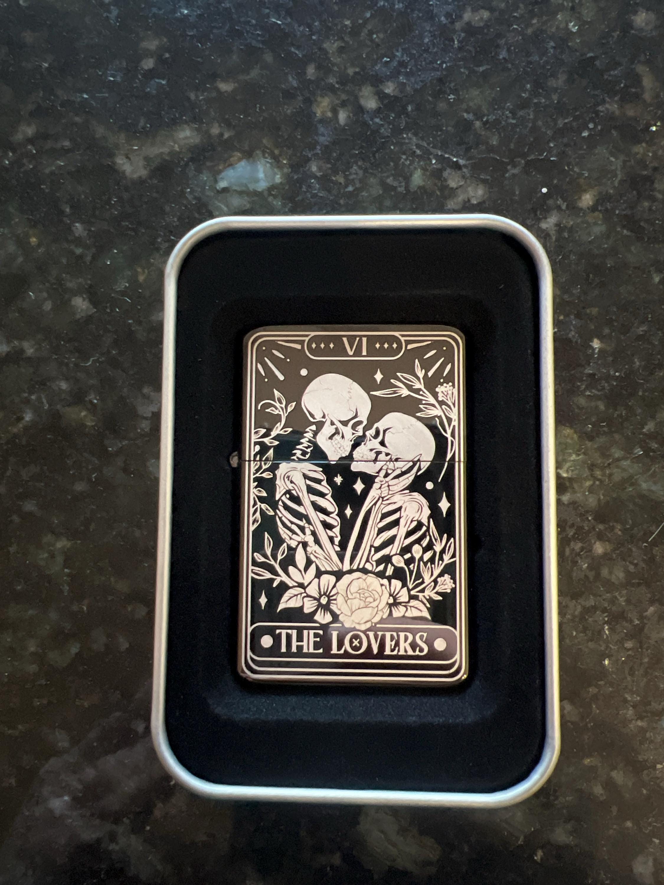 Skull Lovers Tarot Card Custom Engraved Lighter || Personalised Lighter Gift for Him And Her || Brass Flip Lighter Vintage Skeleton Lighter