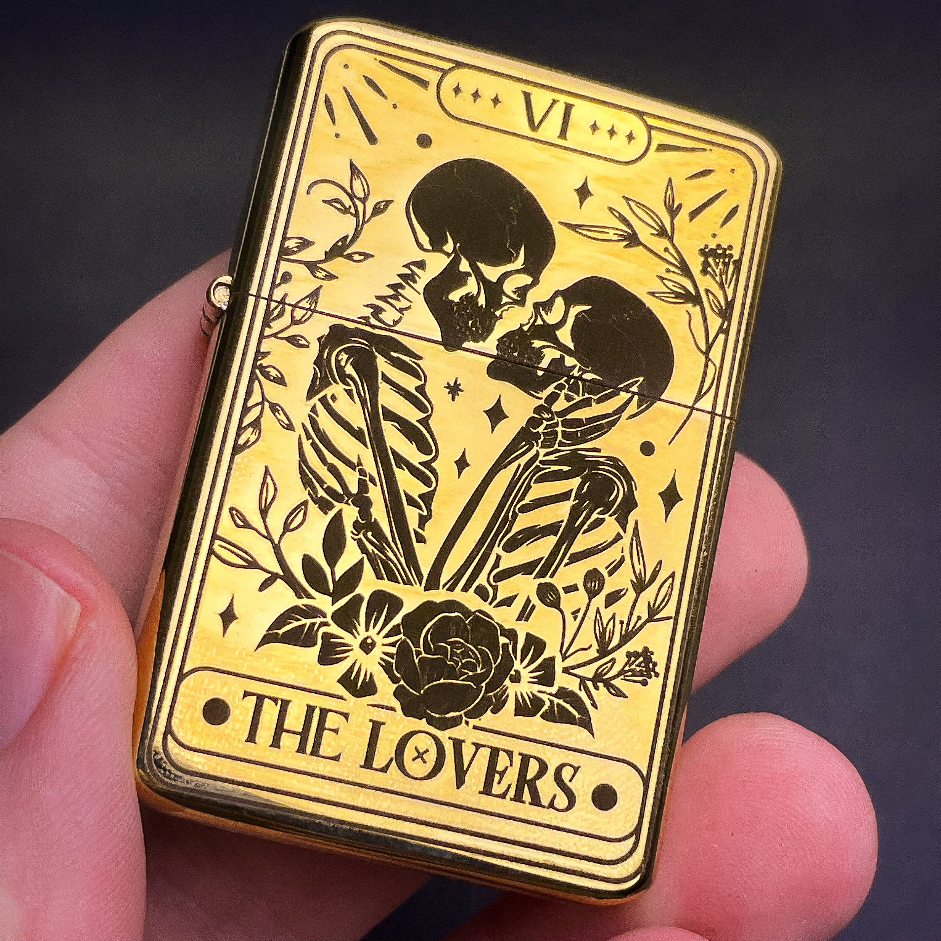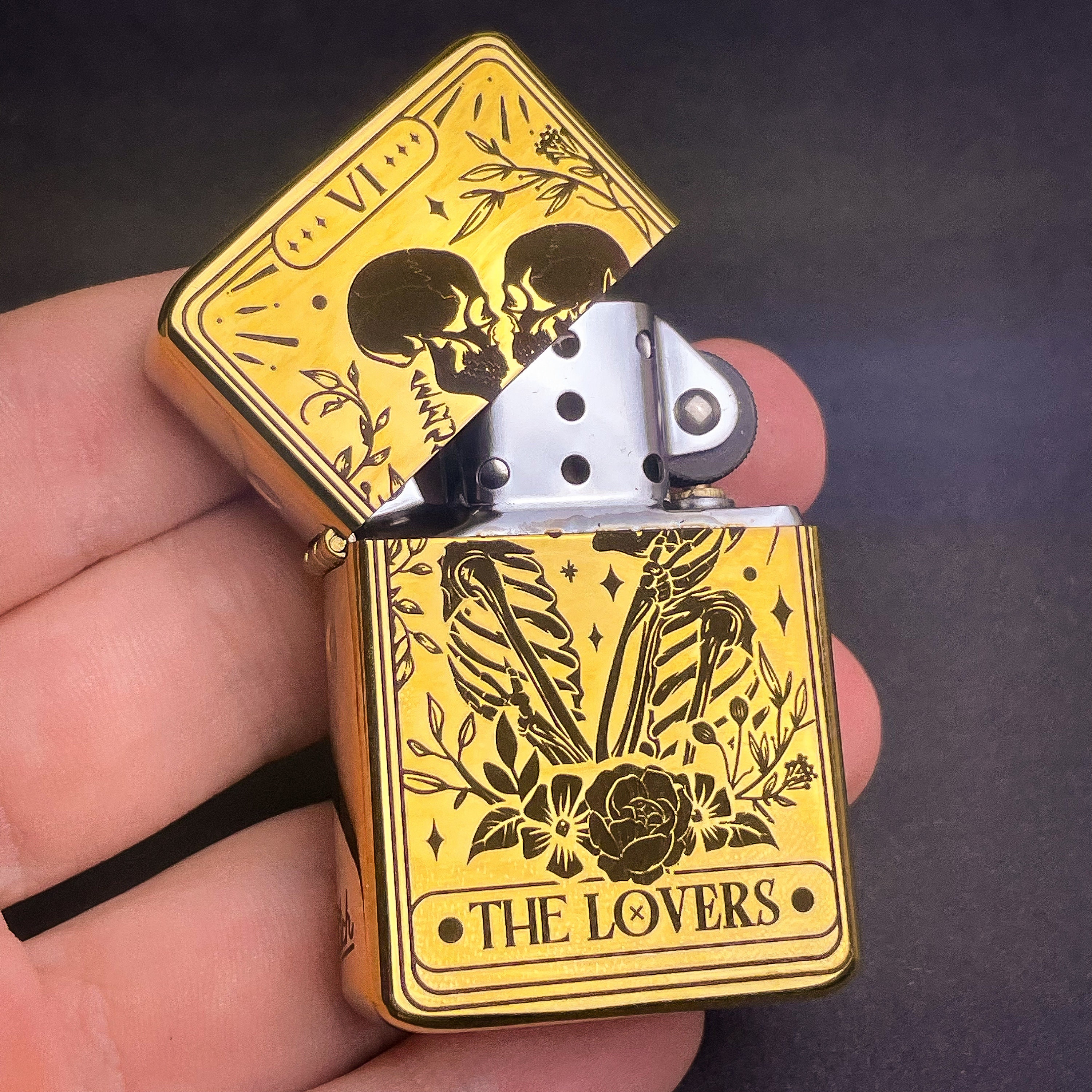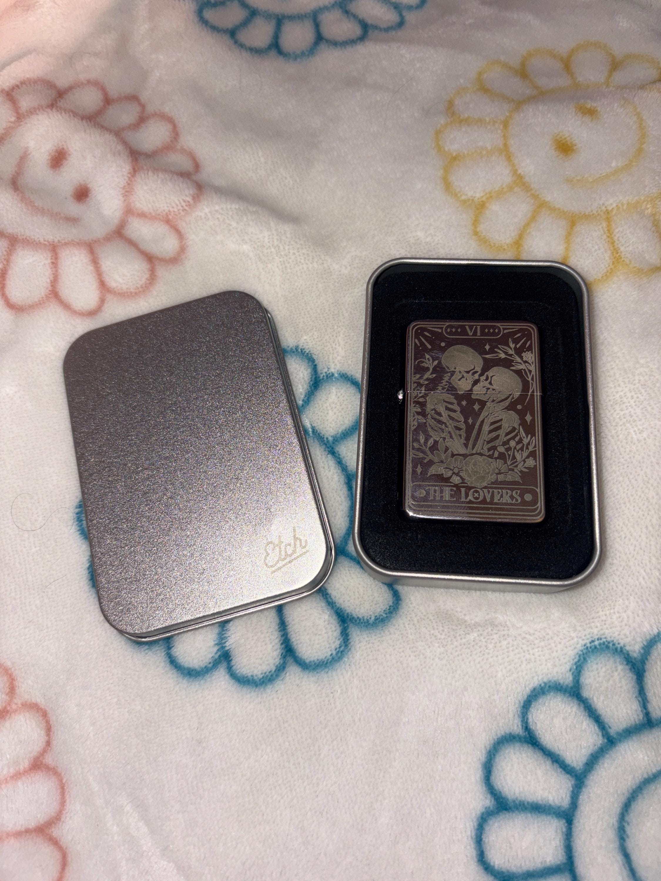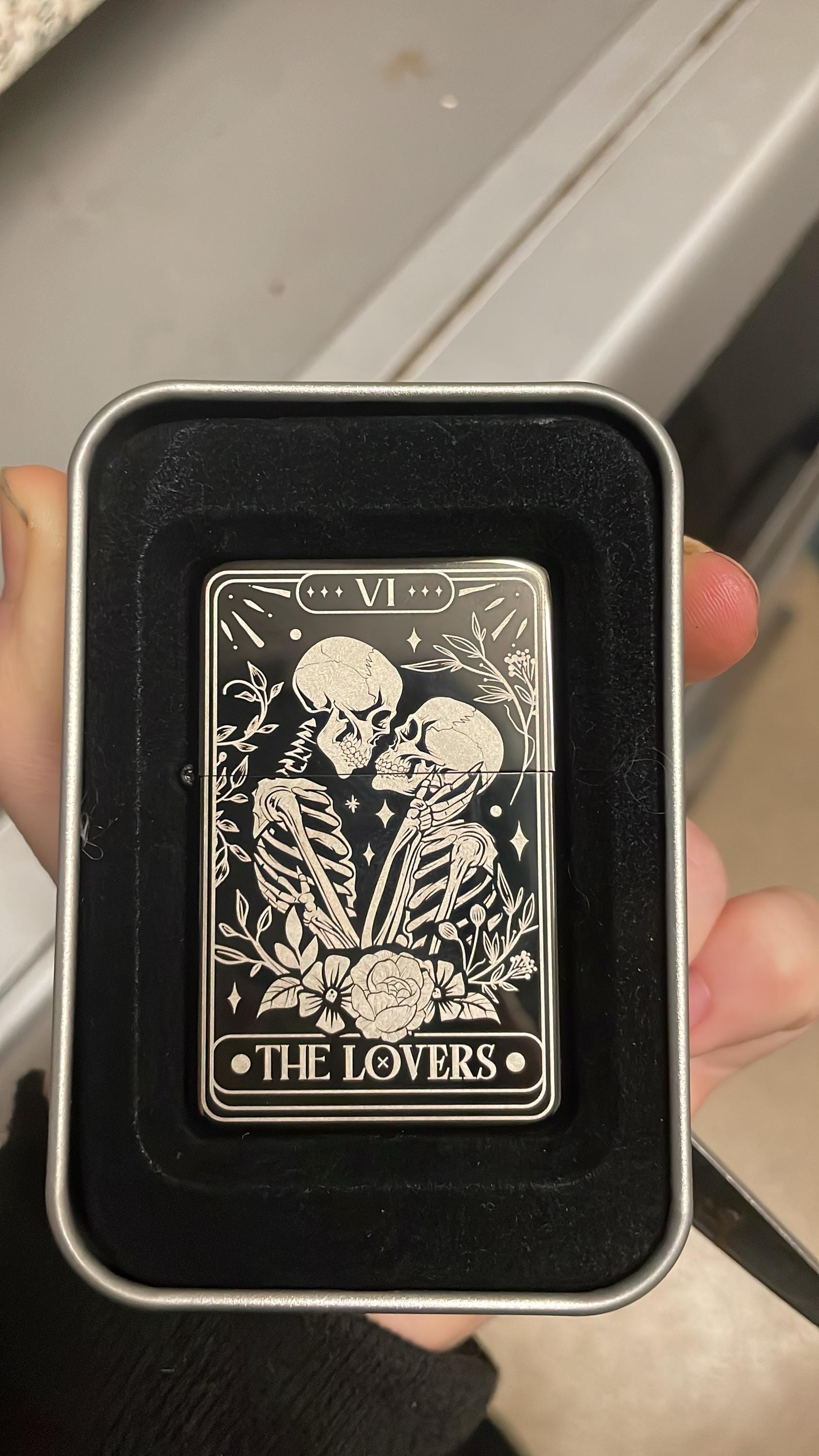 Skull Lovers Tarot Card Custom Engraved Lighter || Personalised Lighter Gift for Him And Her || Brass Flip Lighter Vintage Skeleton Lighter